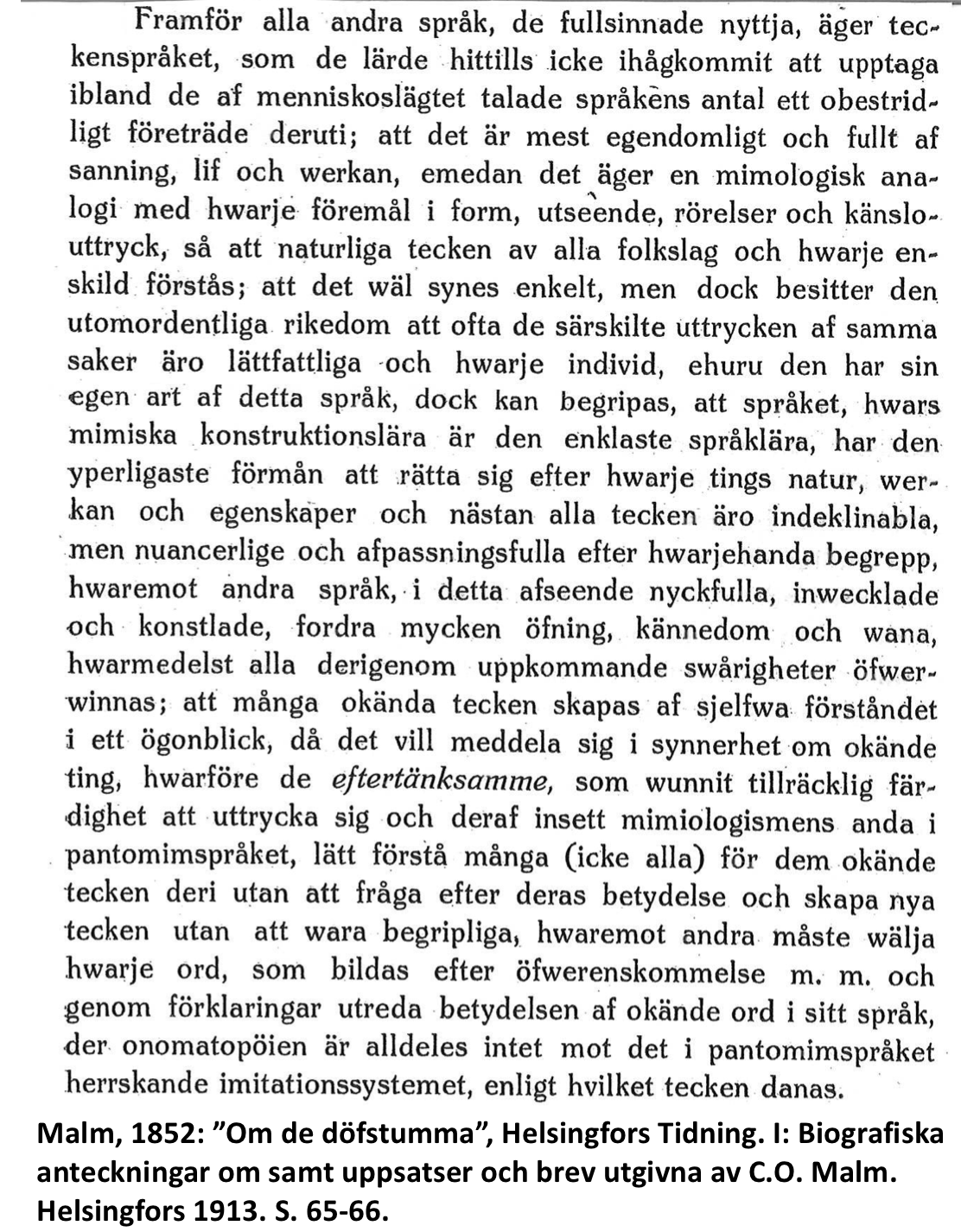 – Teckenspråkets rikedom ligger i det visuella uttryckets möjligheter. Då okända ord i många andra språk kräver långa förklaringar för att bli begripliga, räcker ett tecken i sig för att göra även komplexa fenomen begripliga. Detta konstaterade C.O. Malm redan för över hundrafemtio år sedan, påpekar Kankkonen i inledningen till sitt anförande på teckenspråksdagens seminarium.